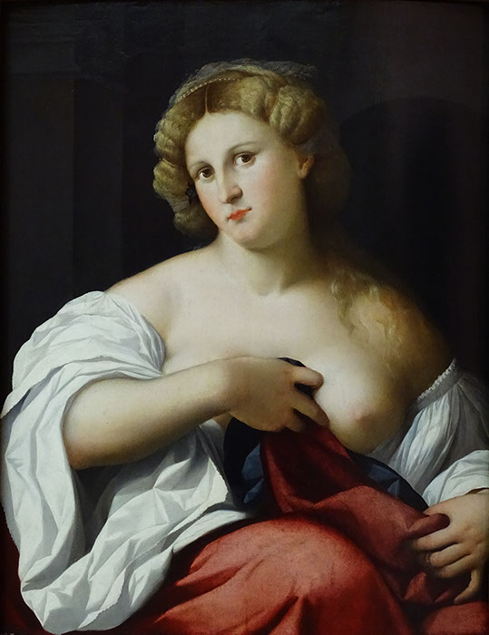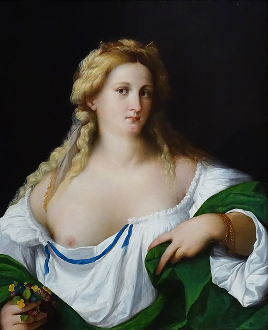 1524-Jacopo Palma (1480-1528). Bildnis einer jungen Frau mit entblösster Brust, 1524-26. Gemäldegalerie Berlin.