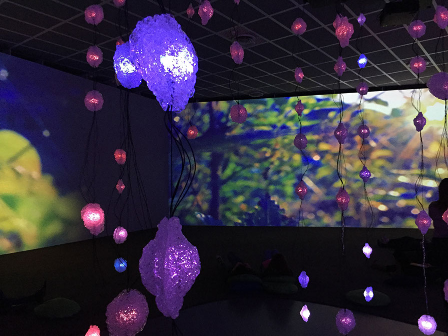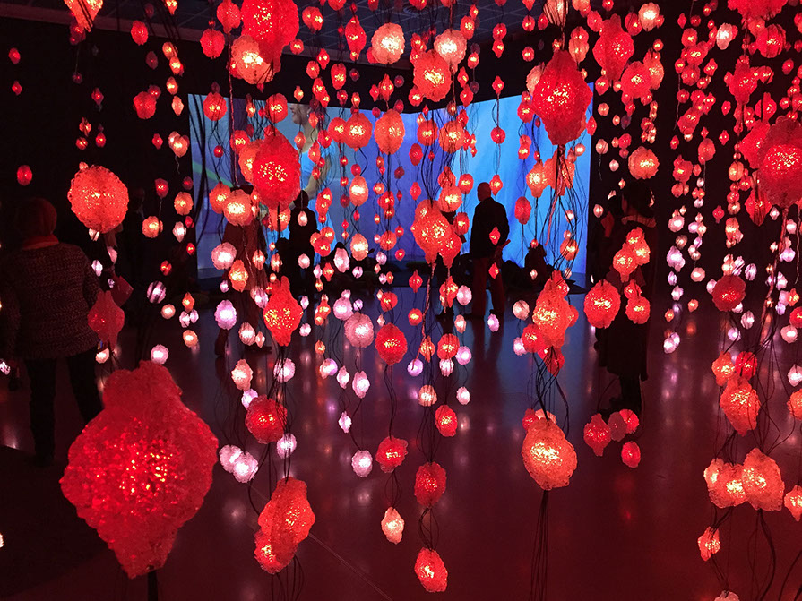 Im Pixelwald. Videoinstallation mit hängenden LED-Lichtern.