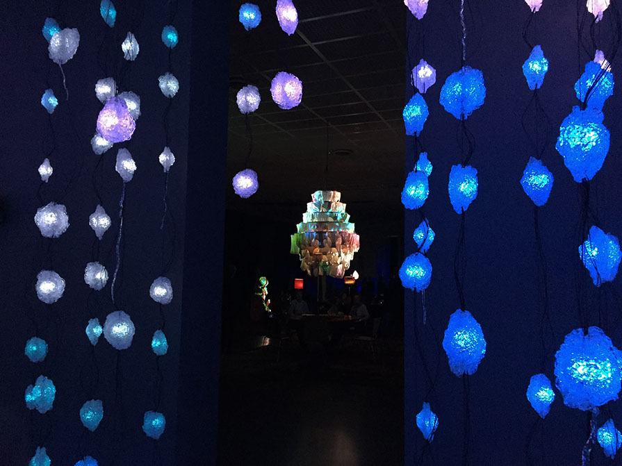 Cape Cod Chandelier – der Leuchter aus lauter Unterhosen, von zwei Projektoren angestrahlt.