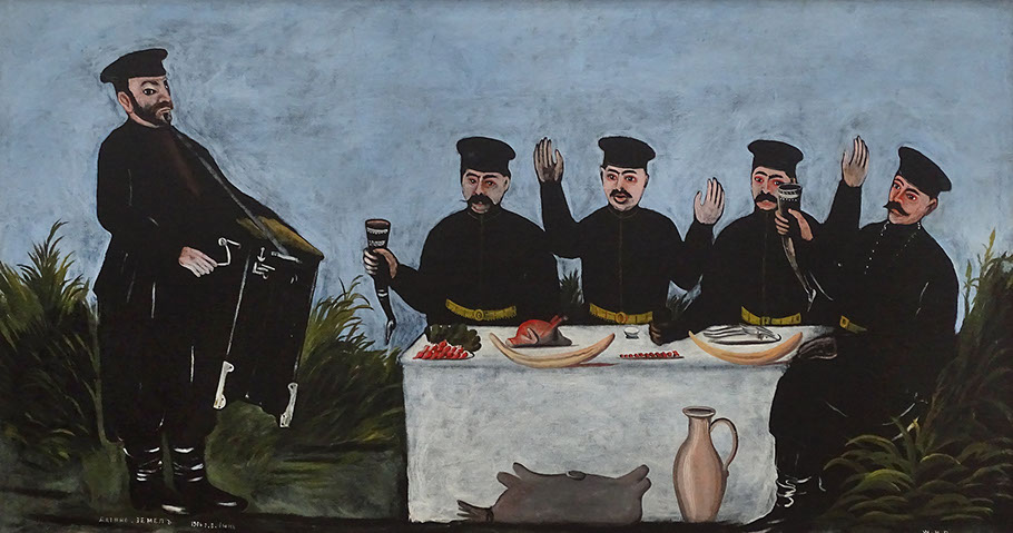 Niko Pirosmani (1862-1918). Gelage mit Leierkastenmann Datiko Semel, 1906. Georgisches Nationalmuseum, Tbilissi.
