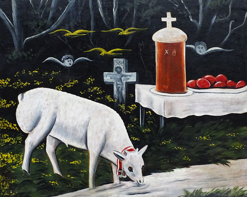 Niko Pirosmani (1862-1918). Lämmchen und Ostertisch mit fliegenden Engeln. Öl auf Karton. Georgisches NatMuseum.