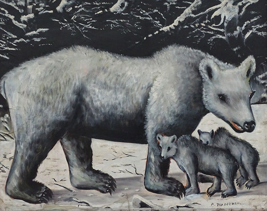Niko Pirosmani (1862-1918). Weisse Bärin mit ihren Jungen. Öl auf Karton. Georgisches Nationalmuseum, Tbilissi.