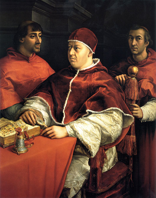 Pope Leo X and his Cousins, Cardinals Giulio de Medici and Luigi de Rossi, 1518-19. Galleria degli Uffizi, Firenze.