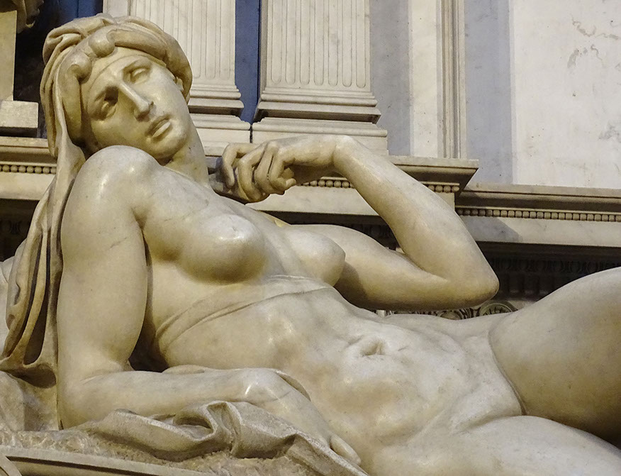 1520-Michelangelo (1475-1564). Grab Lorenzo Medici, Herzog von Urbino. Der Morgen. Medicigräber Florenz.