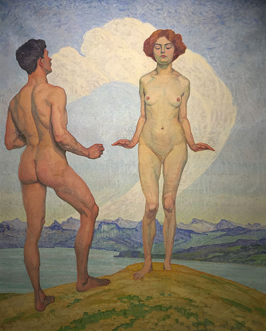Sigismund Righini (1870-1937). Mädchen, von Jüngling bewundert, 1909. Ein Versuch, Ferdinand Hodler zu kopieren.