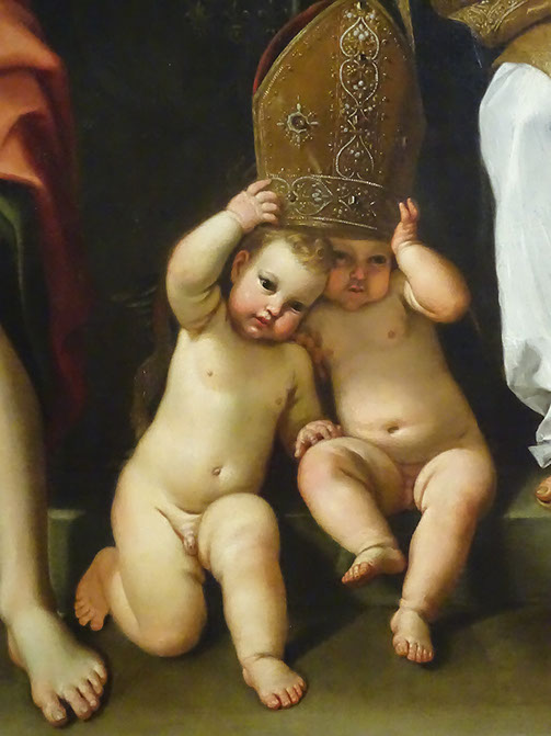 Domenichino (Domenico Zampieri, 1581-1641). Madonna col Bambino e i santi Petronia e Giovanni Evangelista. Detail.