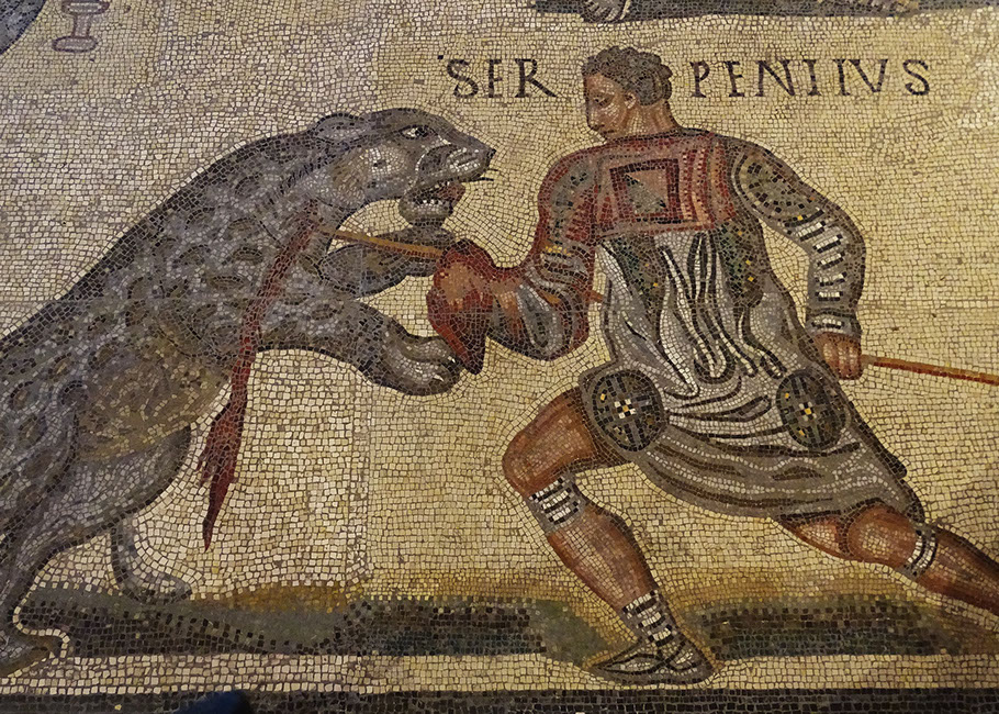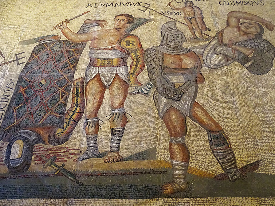 Fragment eines Mosaiks mit Gladiatoren, Torrenuova. Galleria Borghese, Rom.