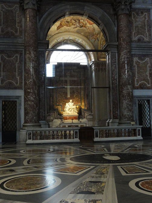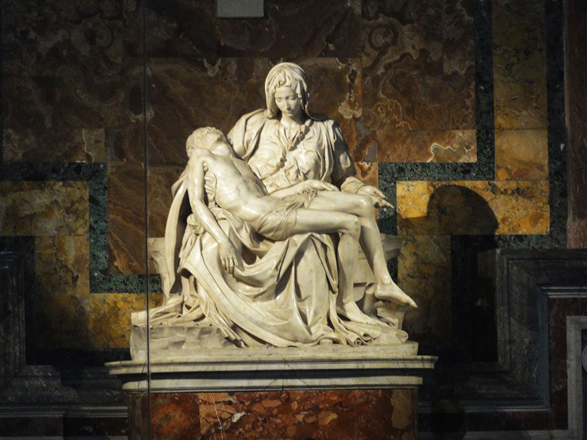 Michelangelo (1475-1564). Pietà, Marmor, 1499. Weit vom Publikum entfernt und hinter Glas.