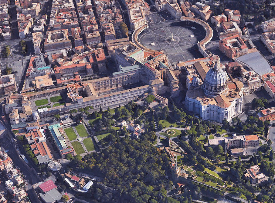 Petersdom, Piazza San Pietro, Gärten und Museen des Vatikans. Foto©GoogleEarth.