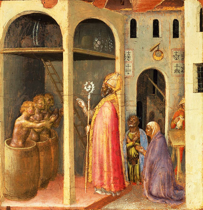 Gentile da Fabriano (1370-1427). Der hl. Nikolaus erweckt drei in Salzlake gelegte Jungen. Pinacoteca Vaticana.