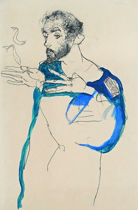 Egon Schiele, Gustav Klimt im blauen Malerkittel, 1913. Leopold Museum Wien, Privatbesitz.
