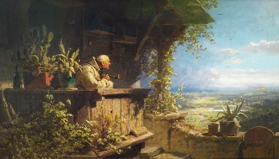 1860-Carl Spitzweg (1808-1885). Verdächtiger Rauch (Klausner schaut ins Land), 1860-62. Museum Georg Schäfer.
