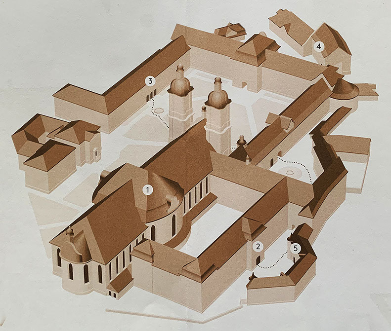 Stiftsbezirk St.Gallen: 1-Kathedrale 2-Stiftsbibliothek 3-Ausstellungsaal 4-Karlstor 5-Kloster-Bistro
