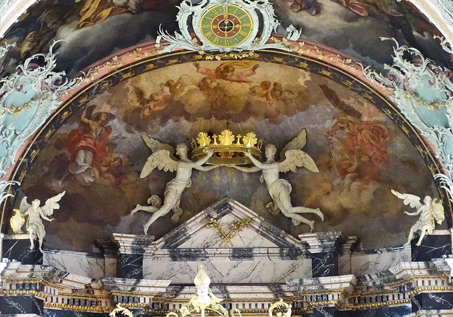 Schwebende Engel mit dem goldenen Kronreif über dem Hauptaltar. Von Josef Sporer.