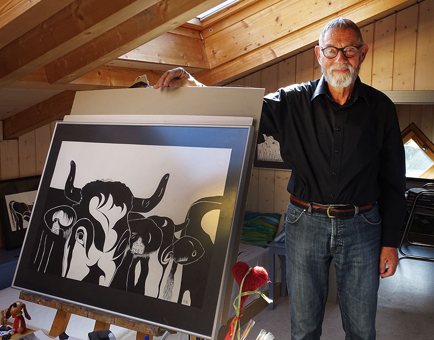 Ruedi Theiler (1944). Bei den Biobauern dürfen die Kühe noch Hörner tragen.
