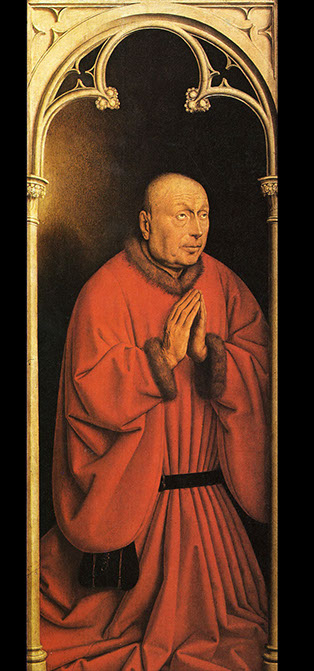 Genter-Altar, geschlossen. Linker Aussenflügel: Betender Stifter des Altars, Jodocus Viyd. closertovaneyck.kikirpa.be