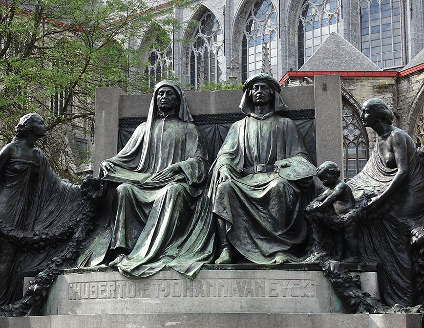 Denkmal von 1913 vor der St. Bavo Kathedrale, Gent. Hubert und Jan van Eyck.