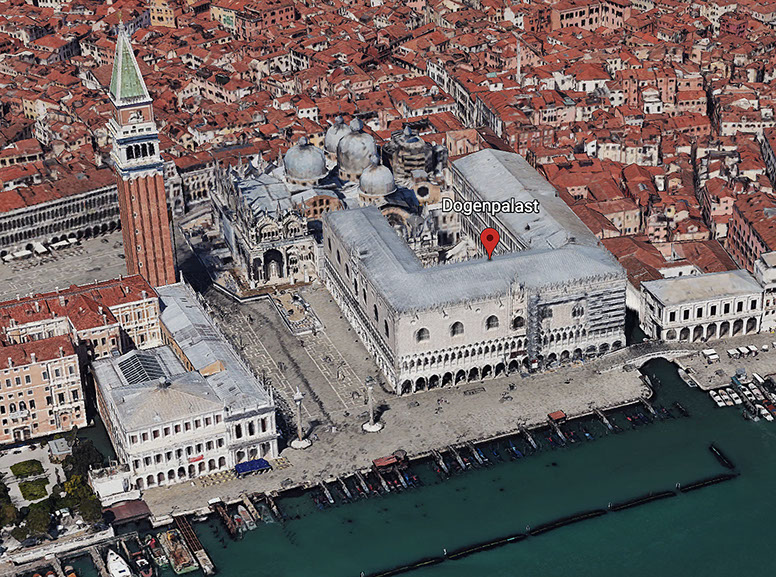 Dogenpalast mit Markusplatz und Basilica di San Marco – Foto GoogleEarth.