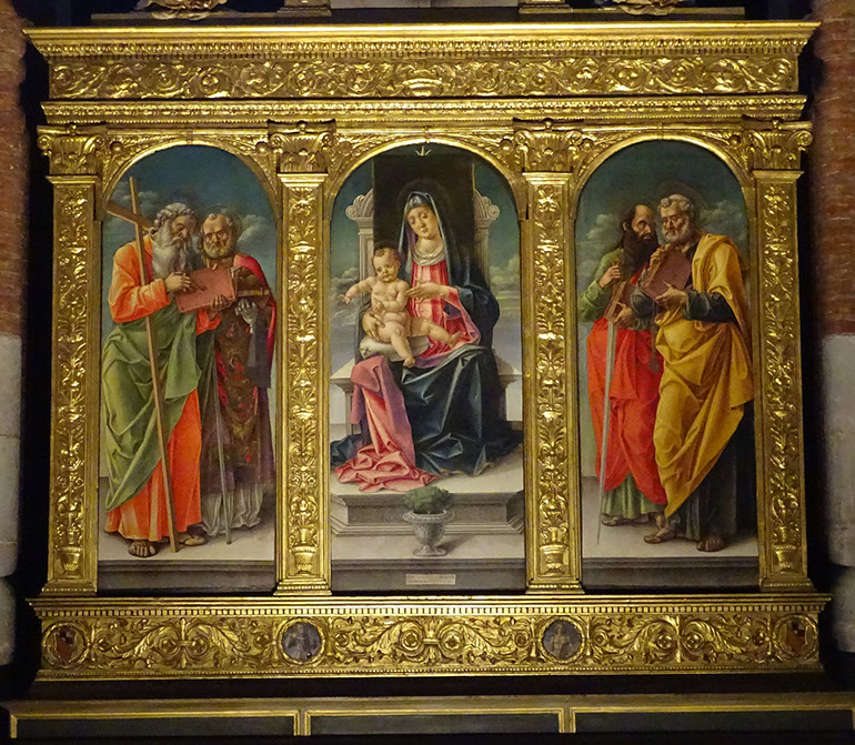 Bartolomeo Vivarini (1430-1491). La Madonna in trono col Bambino e santi Andrea, Nicola da Bari, Paolo e Pietro, 1482.