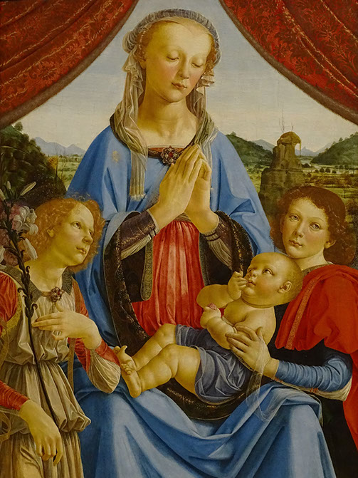 1470-Andrea del Verrocchio (1435-1488). Jungfrau mit sitzendem Kind, 1470. Ausschnitt. Gemäldegalerie Berlin.