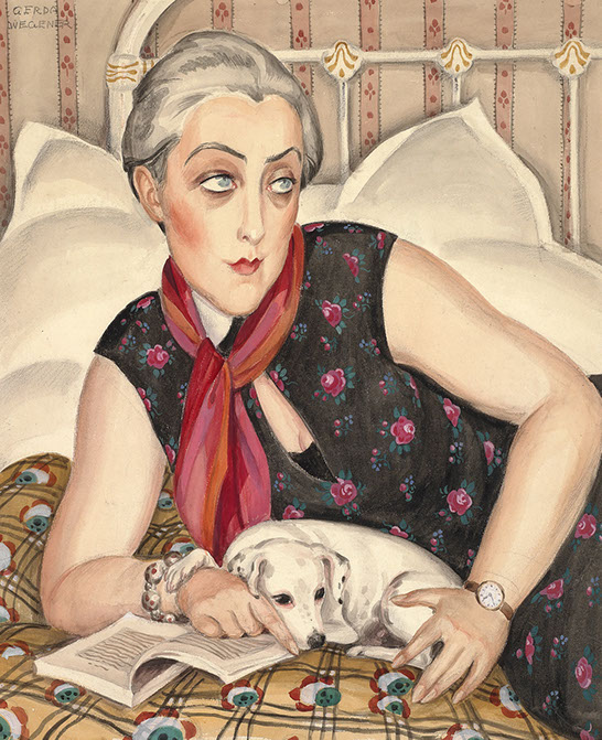 Gerda Wegener (1886-1940). Laesende kvinde med hund, o.J. WikiCommons.