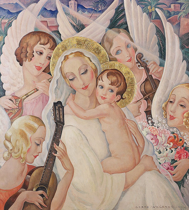 Gerda Wegener (1886-1940). Madonna mit Kind und musizierenden Engeln, 1935. Privatsammlung. WikiCommons.