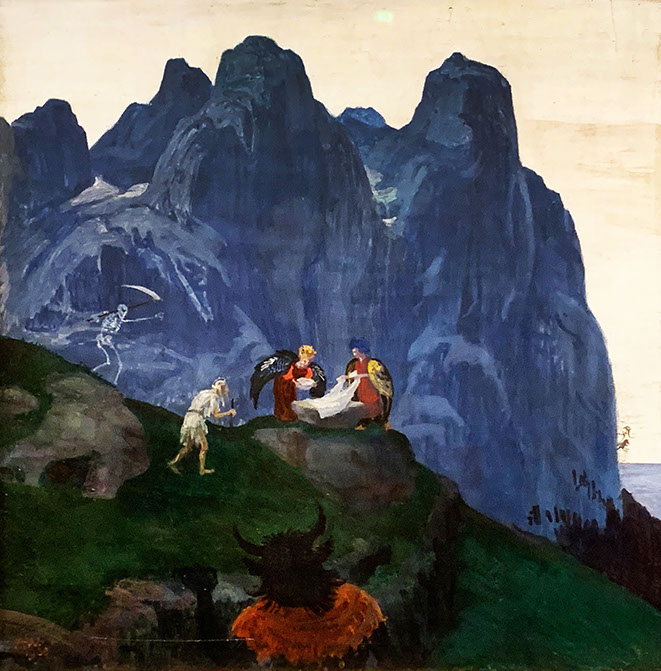 1908-Albert Welti (1862-1912). Berglandschaft mit Einsiedler, Engeln, Tod und Teufel, 1908. Kunsthaus Zürich.