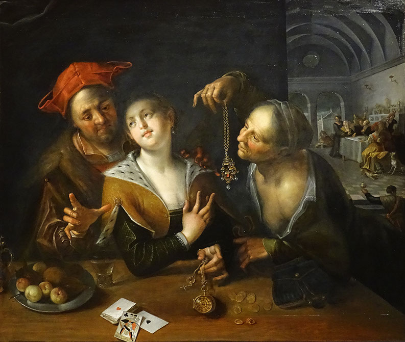 Hans von Aachen (1552-1615). Kupplerin mit Paar, 1605-10.