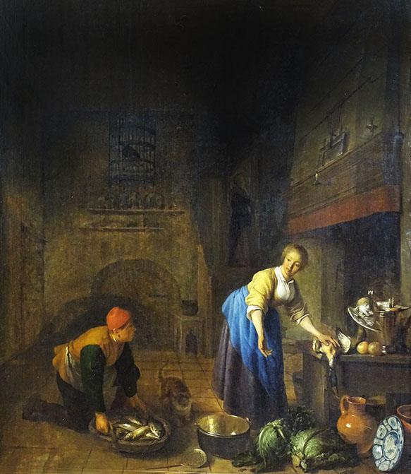 1650-Hendrick Martensz. Sorg (1610-1670). Kücheninterieur mit Magd und Fischverkäufer, 1650.