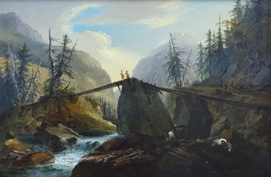 Caspar Wolf (1735-1783). Brücke und Dalaschlucht in Leuk, flussaufwärts gesehen, 1774-77. Musée d'Art du Valais Sion.