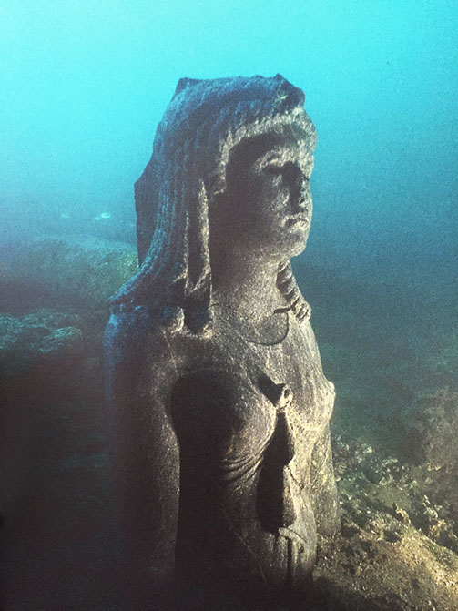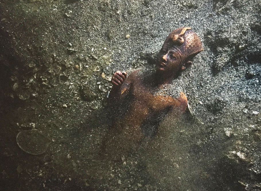 Pharaofigur mit Chepreschkrone, Moment der Entdeckung in Thonis-Herakleion. Maritimes Museum Alexandria.