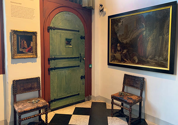 Durch diese robust gesicherte Tür traten die Gäste in Rembrandts Haus ein. Das Empfangszimmer war gleichzeitig Ausstellungssraum für die Bilder, die zum Verkauf standen. Die wartenden Gäste konnten auf Stühlen Platz nehmen und die Bilder studieren.