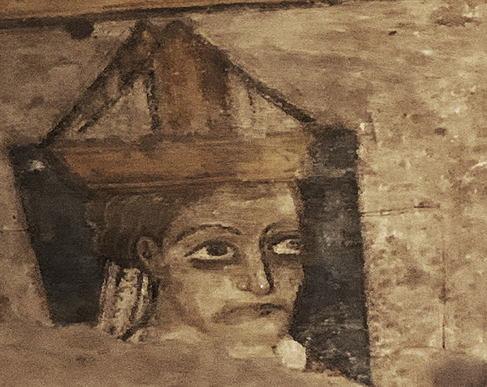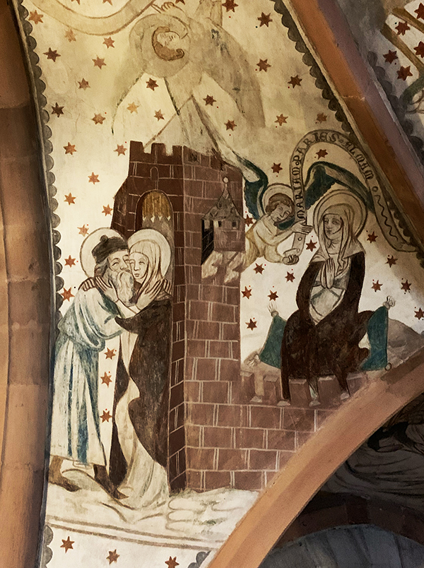 Die Krypta enthält eine ganze Reihe von sehr gut erhaltenen Deckengemälden mit Szenen aus dem Alten und Neuen Testament. Eine der leicht erkennbaren Geschichten ist jene von Joachim und Anna, den Grosseltern Jesu'. Sie zeigt jenen Moment, wo Joachim nach 40 Tagen Fasten in der Wüste nach Jerusalem zurück kehrt und vor der «Goldenen Pforte» des Tempels seine Frau Anna umarmt.