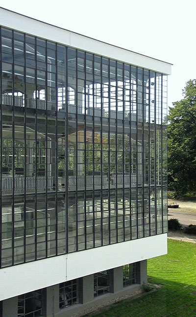 Für den neuen Sitz des «Bauhauses» in Dessau entwirft und baut er 1925 das neue Schulgebäude. In einfacher, funktionaler und schnörkelloser Form aus Beton, Stahl und Glas. Vor allem die gläserne Fassade der Werkstätten ist zukunftsweisend.