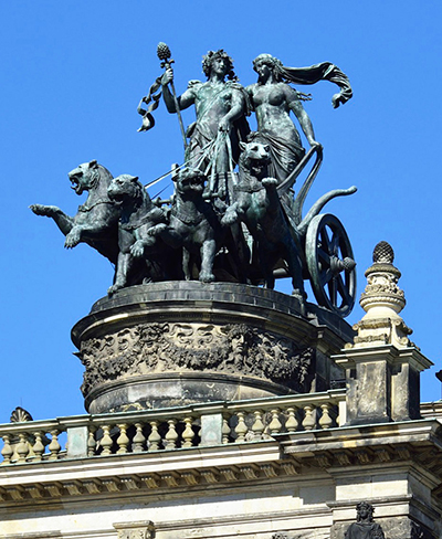 Erst auf den zweiten Blick merkt man, dass diese Quadriga auf der Spitze des Hauptportals eine ganz spezielle ist: Nicht Pferde ziehen den Wagen von Dionysos und Adriane, sondern vier Panther! Das Werk stammt vom einheimischen Bildhauer Johannes Schilling (1828-1910). Einer seiner ersten Auftraggeber war Gottfried Semper. Von Schilling stammt auch das Reiterstandbild von König Johann von Sachsen auf dem Theaterplatz.