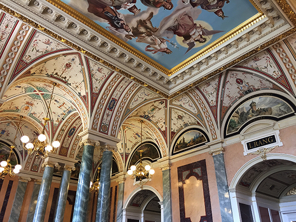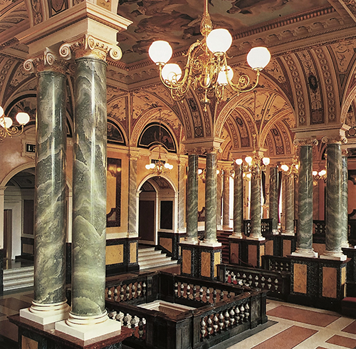 Prächtig geschmückte Vestibüle (Treppenhallen) empfangen die Opernbesucher. Kreuzgewölbe und Deckengemälde mit mythologischen Szenen erinnern an italienische Opernhäuser. Ebenso die exklusiven grün-marmorierten Marmorsäulen.