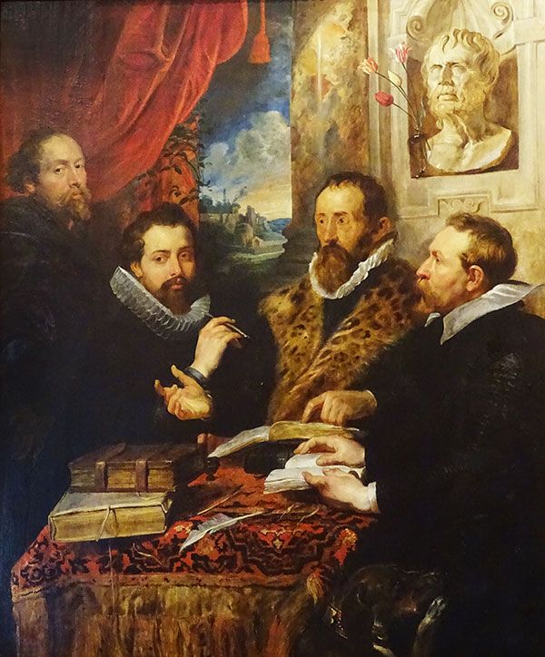 «Die vier Philosophen» heisst dieses Gemälde und wurde um 1611-12 gemalt. Es zeigt links aussen den Künstler als Selbstbildnis, neben ihm sein Bruder Philip. Die anderen beiden Figuren sind echte Philosophen: Rechts aussen der deutsche Johann von Wowern (1574-1612). Der steif da sitzende Mann im Pelz ist Justus Lipsius. Der lebte schon nicht mehr, als Rubens das Bild malte.