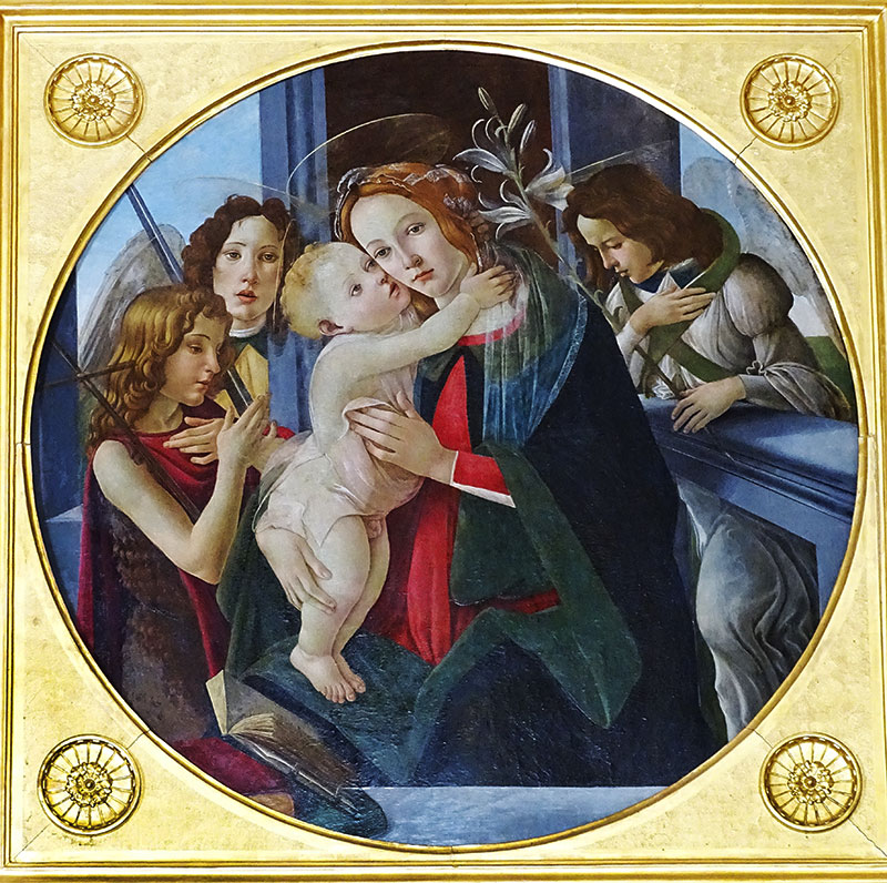 «La Santa Famiglia e Angeli» heisst dieses Bild und stammt wahrscheinlich nicht vom Künstler selbst, sondern wurde in seiner Schule gemalt. Der Malstil Botticellis ist allerdings unverkennbar.