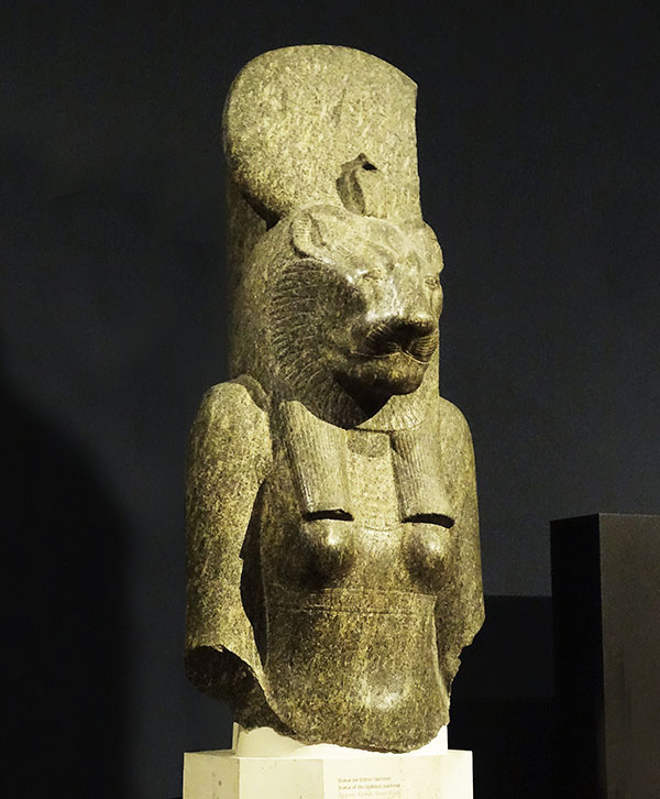 Auch die Göttin Sachmet wird durch eine Tiergestalt verkörpert, den Löwen. Aus Karnak stammt diese wunderschöne Granitfigur aus der 18. Dynastie, also etwa um 1375 v.Chr.