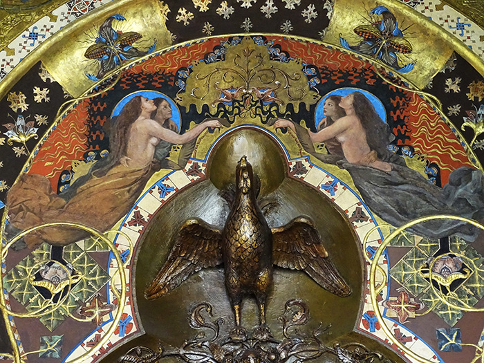 Steigt der Wiederauferstandene aus einer Holzkiste oder aus seinem Grab? Lebendig wirkt er (noch) nicht wirklich mit seiner extremen Blässe und mit den geschlossenen Augen. Auf den Tod hin weist auch der abgestorbene Baum auf der Felsklippe rechts. Und ebenso die öde Landschaft im Hintergrund.