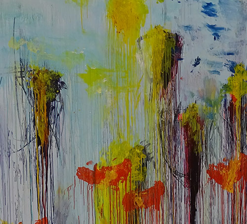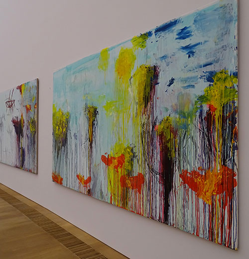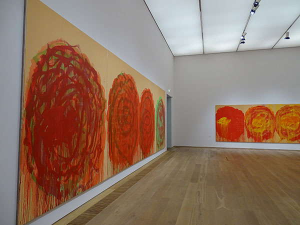 Eigens für den zentralen Raum des Museums Brandhorst hat der Künstler seinen Rosenzyklus geschaffen. Natürlich malt er seine Rosen nicht als Rosen. Sondern als intensive Monumental-Farbkleckse. Er übernimmt nur die «Urform» der Blüte und lässt seinen Pinsel schwingen, dick gefüllt mit Farbe, die durchaus noch auf der Leinwand fliessen darf/soll. In Grün, Gelb, Rot, Orange, Blau.
