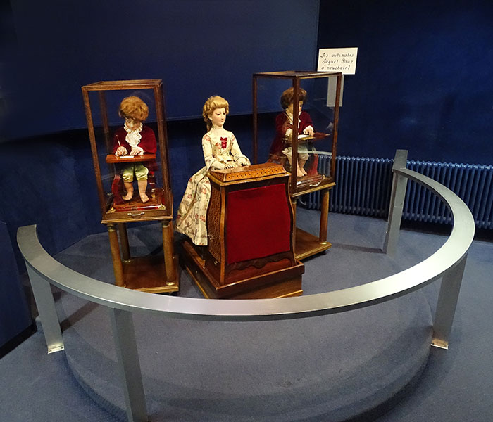 Die in den 1770er-Jahren entstandenen Maschinen sind Werke feinster Uhrmacherkunst. Es sind Figuren, die einen Zeichner, eine Musikerin und einen Schreiber in Aktion zeigen. Gebaut von Vater und Sohn Jaquet-Droz und ihren Mitarbeitern.