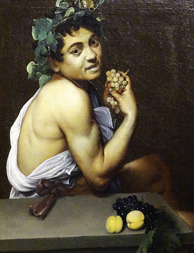 In diesem Gemälde von 1592-95 stellt sich der Künstler selbst dar – als kranken Bacchus. Die blutleeren Lippen und die grünliche Hautfarbe zeigen die Krankheit sehr naturalistisch. Es ist zu einer Zeit enstanden, als er seine legendäre «chiaro-scuro»-Maltechnik (hell-dunkel, mit starken Schatten) noch nicht konsequent anwandte.
