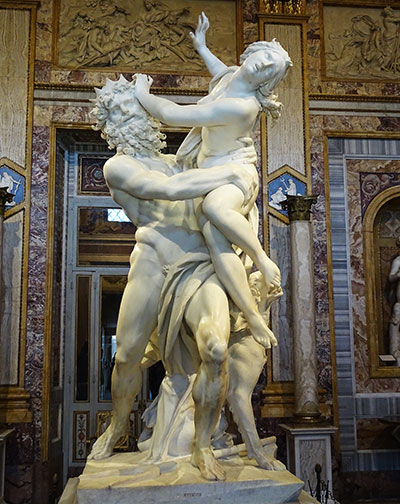 Die Skulptur aus weissem Carrara-Marmor ist eine bildhauerische Sensation. Bernini gelingt es, den Marmor förmlich zu Fleisch werden zu lassen. Das Detailbild zeigt, wie sich die Hand des Pluto in den Schenkel der Proserpina gräbt. Als wäre dieser nicht aus Stein. Bildhauerkunst in Vollendung.