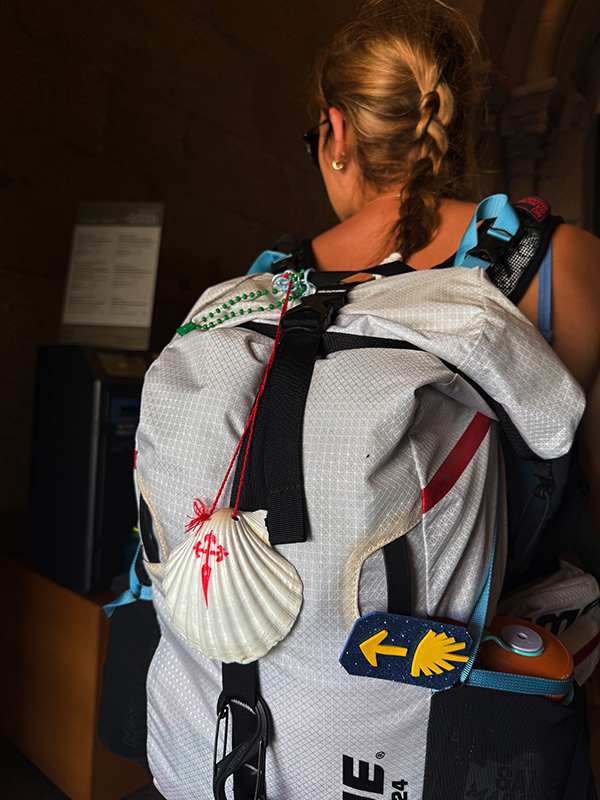 Mit der Jakobsmuschelam Rucksack. |