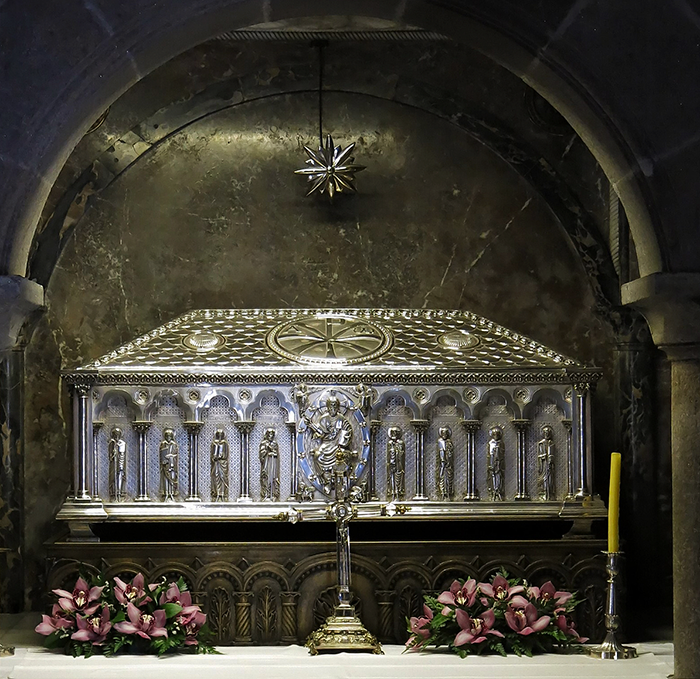 Der silbrige Sarkophag soll die Gebeine des Heiligen und zwei seiner Schüler enthalten. Und von welchem Papst wurde Jakobus heilig gesprochen? Von keinem Papst, denn alle Jünger Christi, heisst: alle zwölf Apostel, werden von der katholischen Kirche als Heilige geführt.