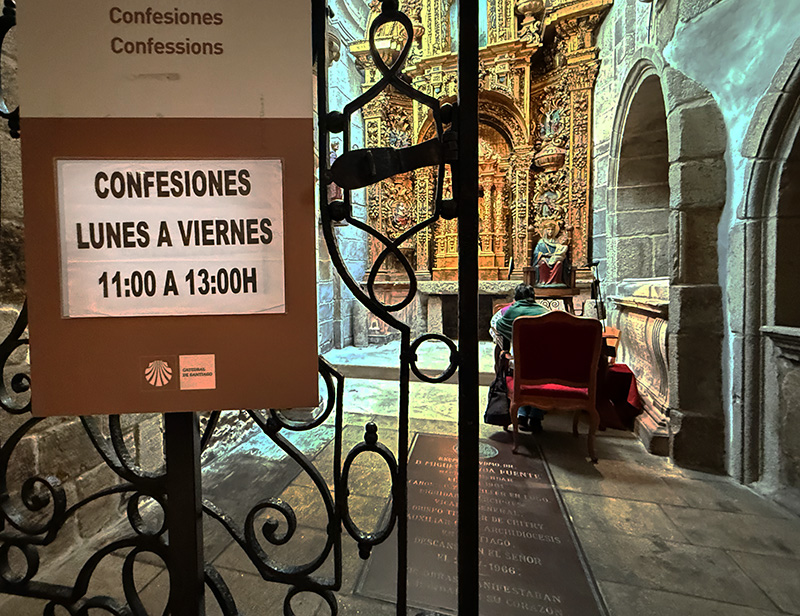 Von Montag bis Freitag (je 11 bis 13 Uhr) können Pilger und Gläubige in mehreren separaten Räumen und in verschiedenen internationalen Sprachen ihre >Confesiones ablegen (Beichte). |
