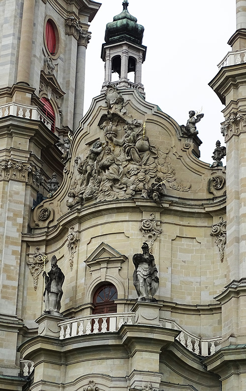 Ziemlich ungewöhnlich. Üblicherweise wird eine Kirche oder Kathedrale einem Heiligen geweiht. Die St. Galler Kathedrale hat gleich deren fünf, die an der Hauptfassade verewigt sind: