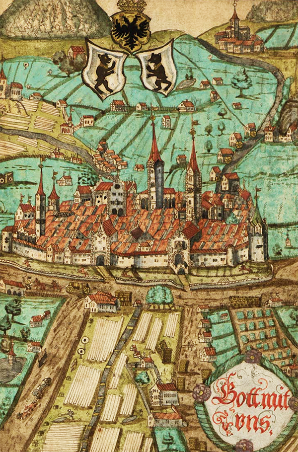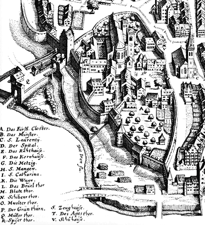 Stadtansicht 1642 mit Mauer um den Stiftsbezirk.