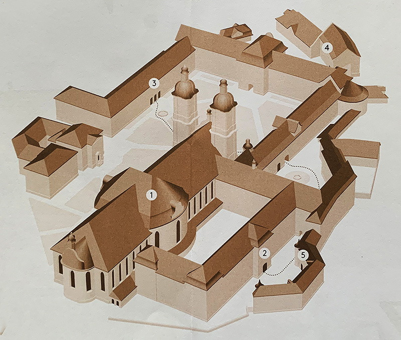 Der Stiftsbezirk heute: . 1-Kathedrale 2-Bibliothek